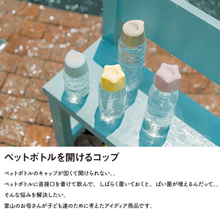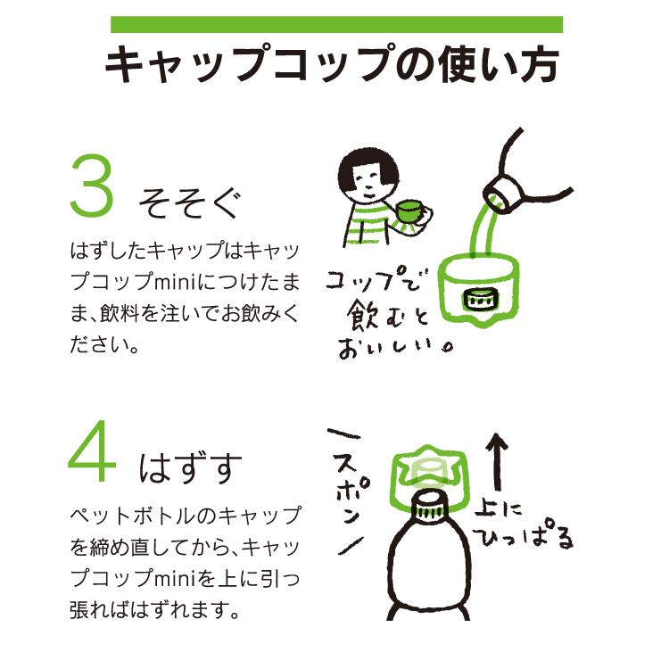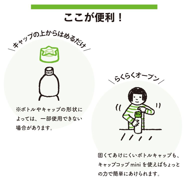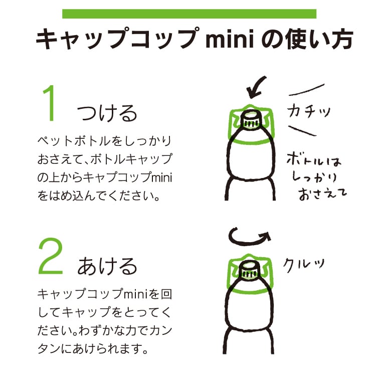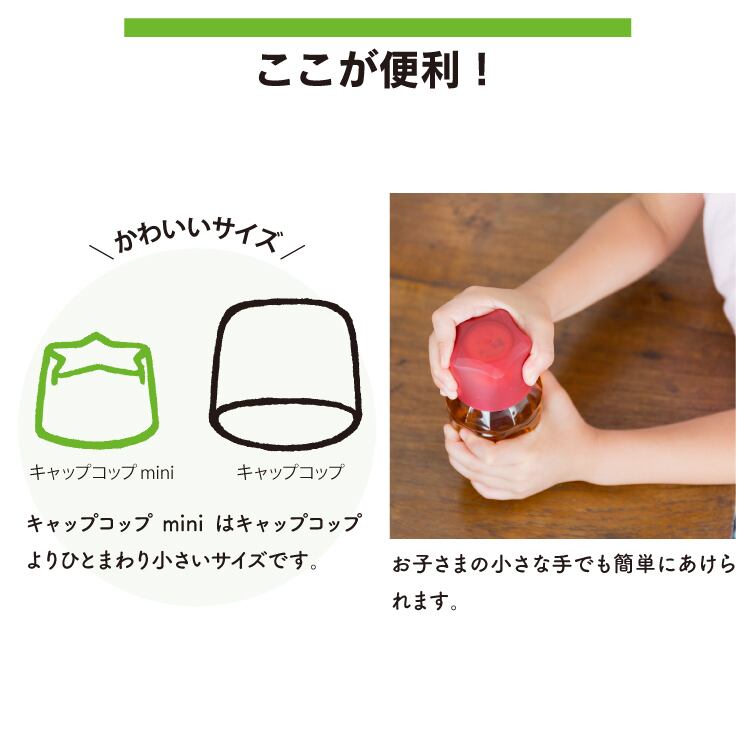 キャップコップmini。お子様からお年寄りまで安心してお使いいただけるよう、プラスチック製品は、国産原料を使用し国内で製造しています。